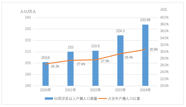 截至2024年末,全市60周岁及以上户籍老年人口233.99万人,占全市户籍总人口的30.6%;全市65周岁及以上户籍老年人口163.99万人,占全市户籍总人口的21.5%。