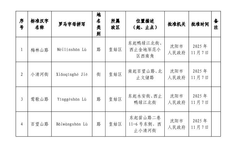 按照《地名管理条例》相关公告要求,经沈阳市人民政府批准,现将皇姑区梅林山路等4条道路命名情况公告如下: