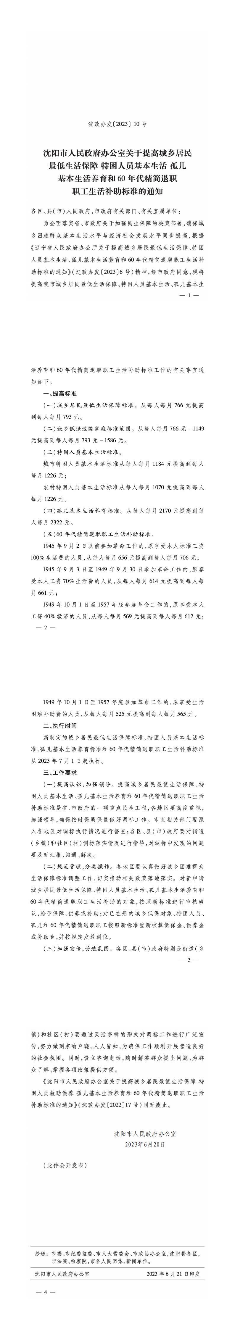 沈政办发〔2023〕10号沈阳市人民政府办公室关于提高城乡居民最低生活保障特困人员基本生活孤儿基本生活养育和60年代精简退职职工生活补助标准的通知